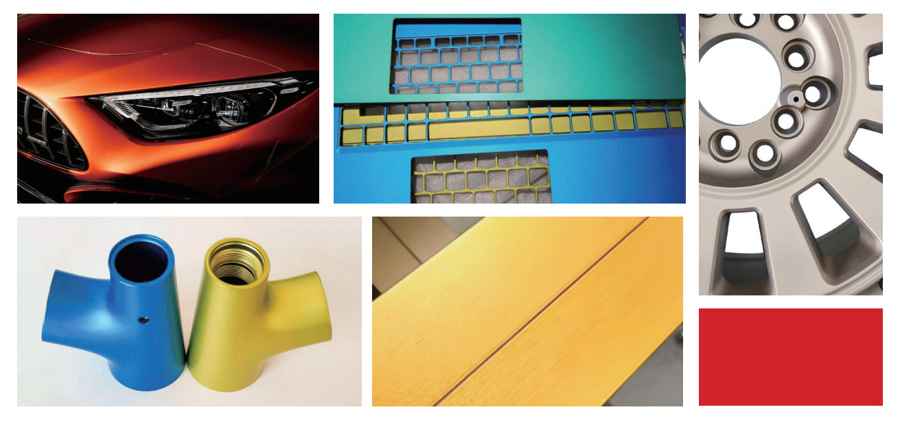 通過有機/無機包覆,在鋁片表面形成一層均勻致密的致色層,使得鋁顏料具有高金屬質感和遮蓋效果、耐候性、耐酸堿等優(yōu)異性能,具有豐富多彩的顏色效果。有機彩鋁是有機色粉和銀漿接枝,采用高分子保護,顏色豐富穩(wěn)定,耐溫良好。無機彩鋁是水性銀漿包覆氧化鐵,類似珠光效果同時具備高金屬質感,耐高溫,耐酸堿。廣泛應用于粉末涂料、汽車涂料、油墨、3C、UV等行業(yè)。